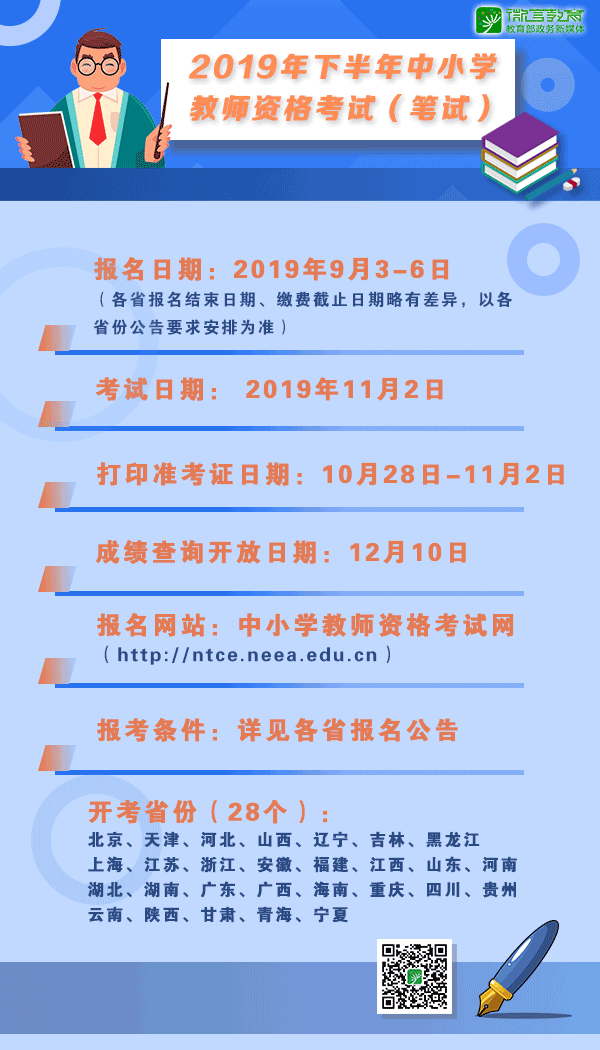 2019年下半年教师资格考试(笔试)日期定于11月2日,本次考试报名日期自9月3日开始。
