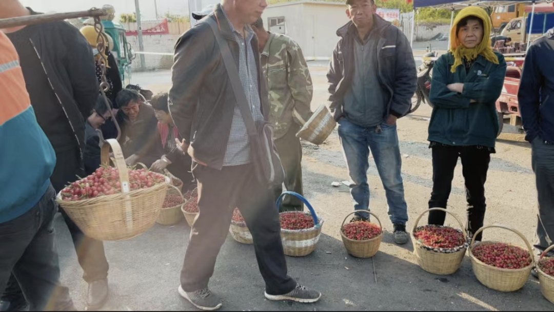 经过一个多小时的采摘,五个大篓子已经被装得满满当当。为卖出好的价钱,老胡和女婿急忙挑下山,开车到附近售卖。山色峪停车场外格外热闹,每年樱桃季,这里都会聚集大量的商贩来收购樱桃。“樱桃价格每日不同,根据品相从10元到20多元不等。 ”一位商贩说。