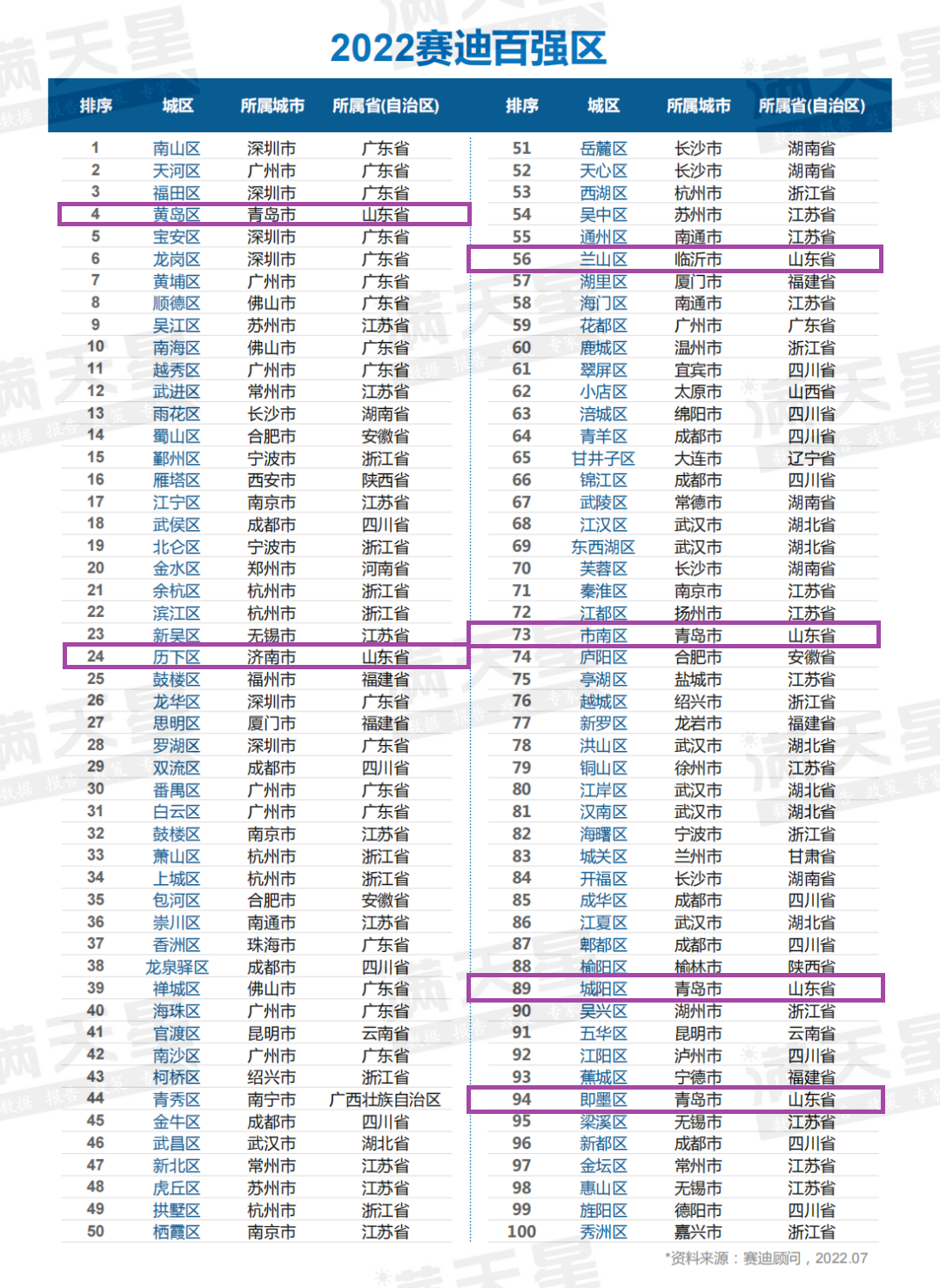 记者在梳理榜单时看到,山东上榜城区数量为6个。具体到城市来说,青岛、济南、临沂分别上榜4个、1个、1个城区。