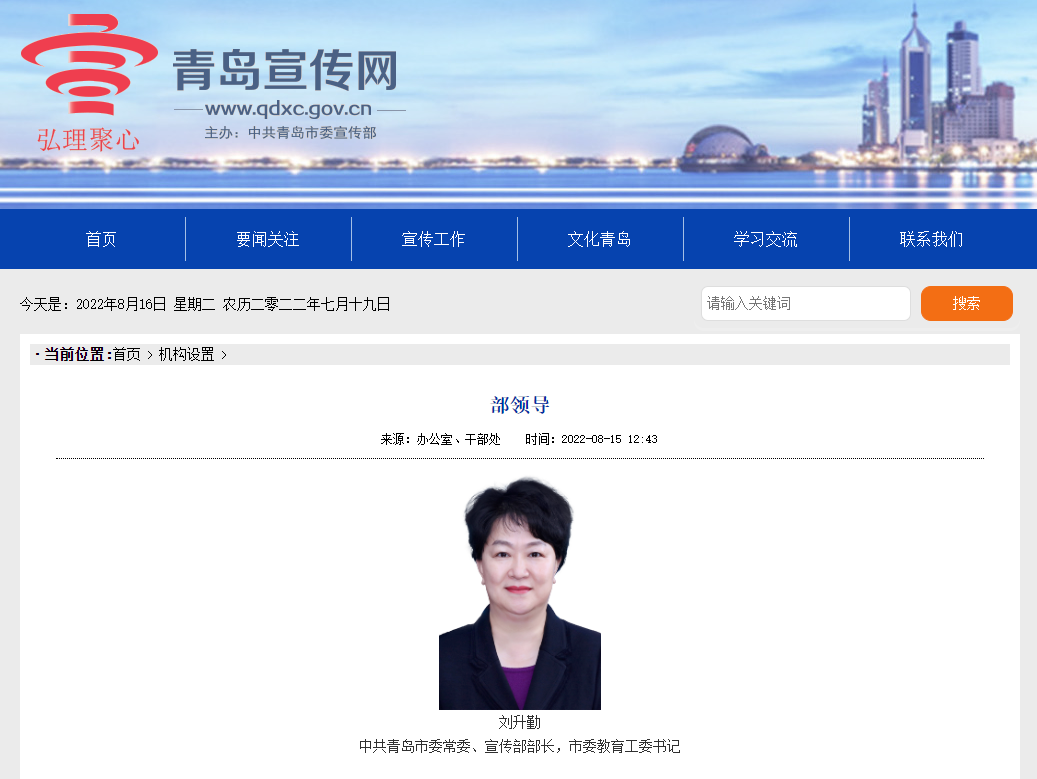 青岛宣传网“机构设置”的“部领导”一栏最新信息显示:刘升勤同志已任中共青岛市委常委、宣传部部长、市委教育工委书记。